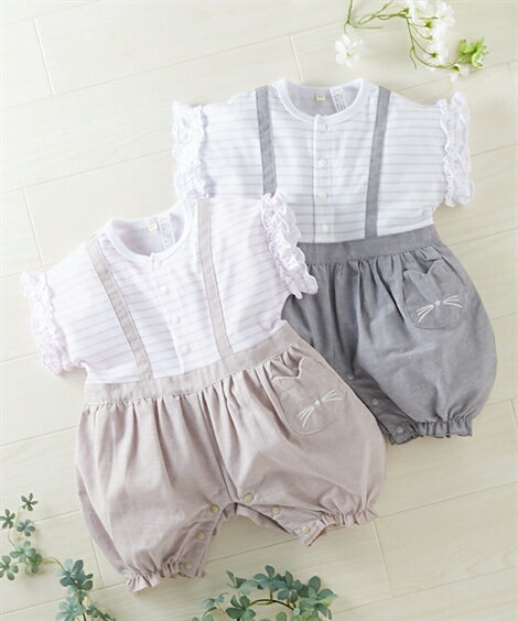 カバーオール ベビー 吊りズボン 重ね着風 半袖 ベビー服 子供服 男の子 女の子 グレー ねこポケット /グレー 衿付 /ベージュ ねこポケット /ベージュ 衿付 身長70/80cm ニッセン nissen