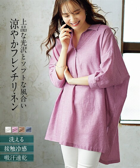 シャツ レディース フレンチリネン混 スキッパー チュニック ぽっこりお腹が気にならない 吸汗速乾 接触冷感 夏 オフホワイト/ブルー系/モカ/ラズベリー系 S/M/L/LL ニッセン nissen