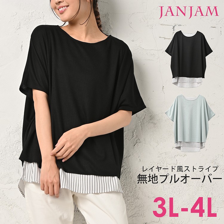 メール便対応 大きいサイズ レディース 重ね着風プルオーバー 無地+ストライプ柄 半袖 ドルマンスリーブ トップス 3L/4L ゆったりサイズ ぽっちゃり女子 プラスサイズ