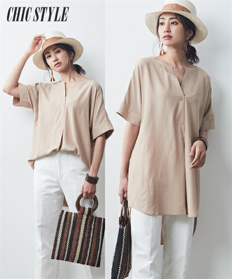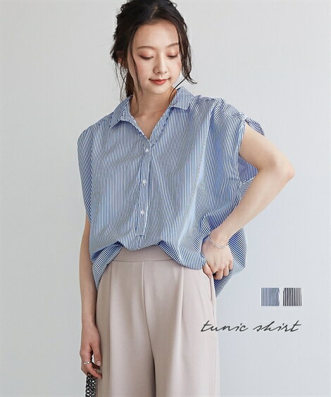シャツ レディース ドルマンスリーブ スキッパー チュニック ブルー系ストライプ/黒系ストライプ M/L ニッセン nissen